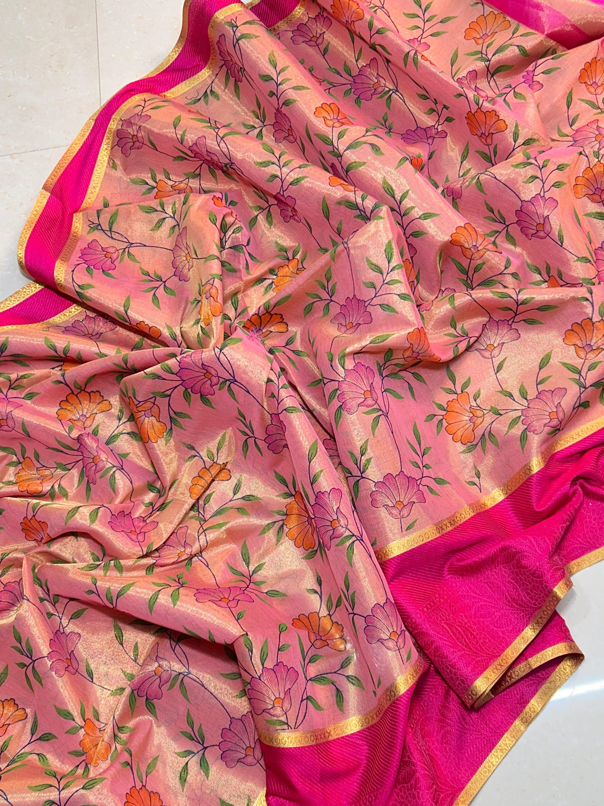Pink colour saree with floral hand brush work