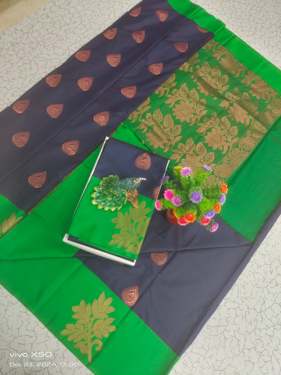 + Free ShippingBlue Soft Silk Saree with green border blouse and pallu