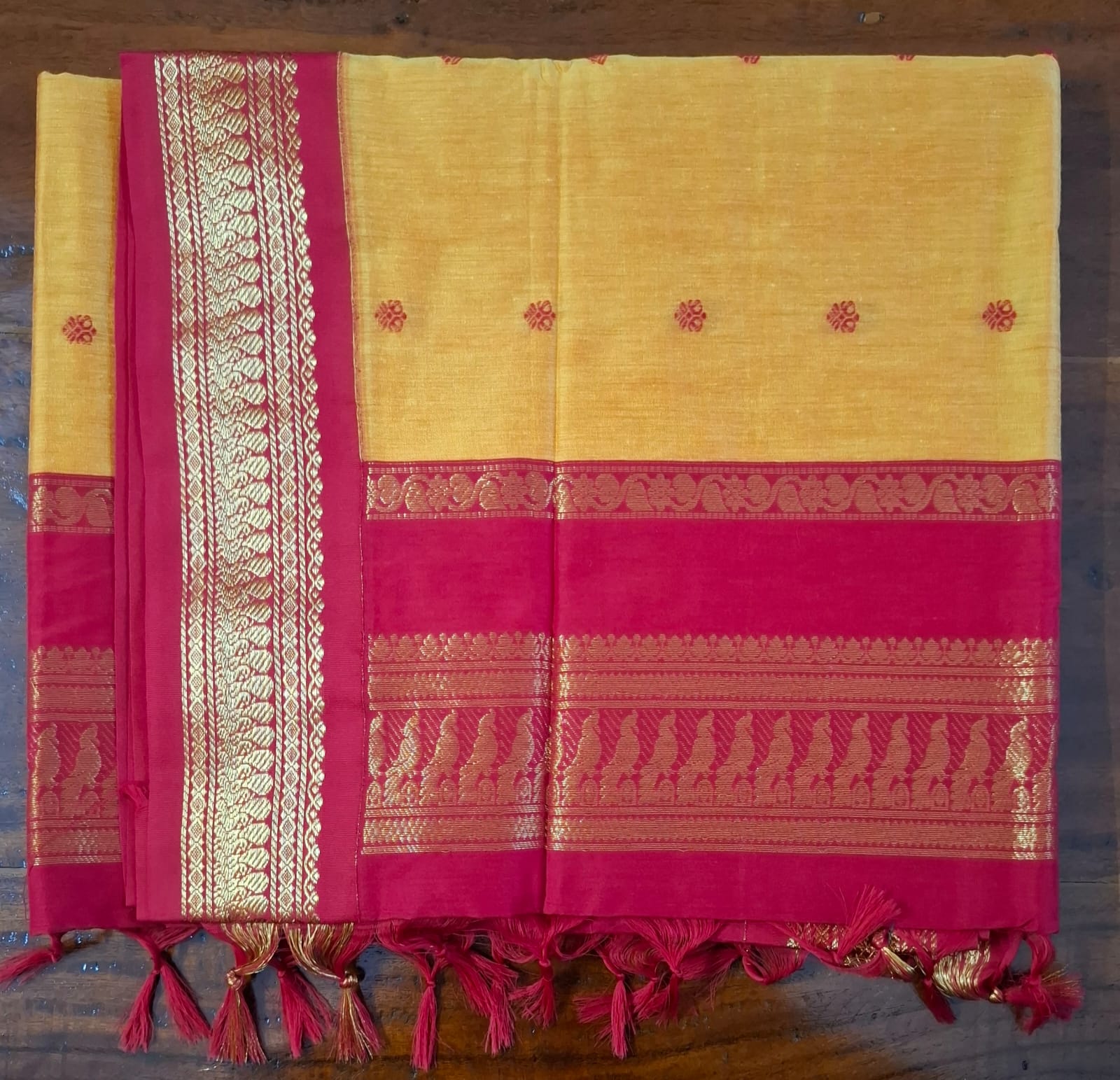 Mango yellow Kalyani Cotton Saree with pink border blouse and rich pallu
