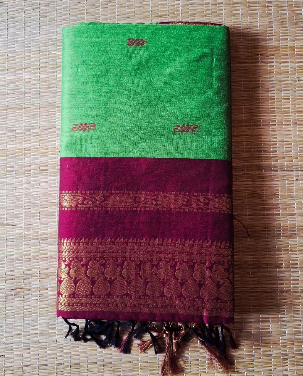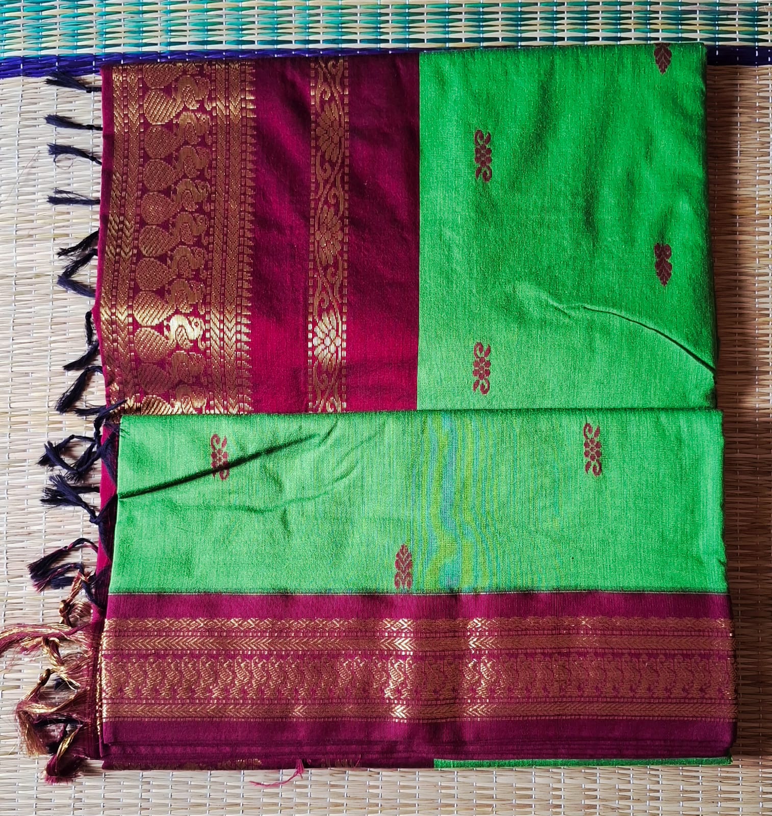 Green saree with maroon border blouse and rich pallu