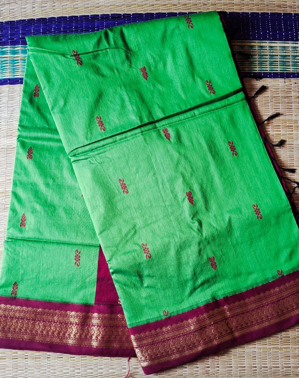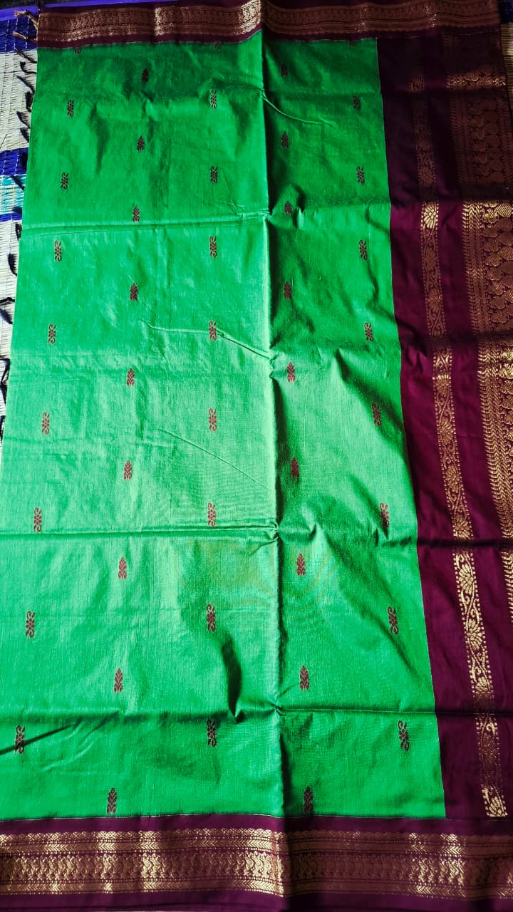 + Free ShippingGreen saree with maroon border blouse and rich pallu