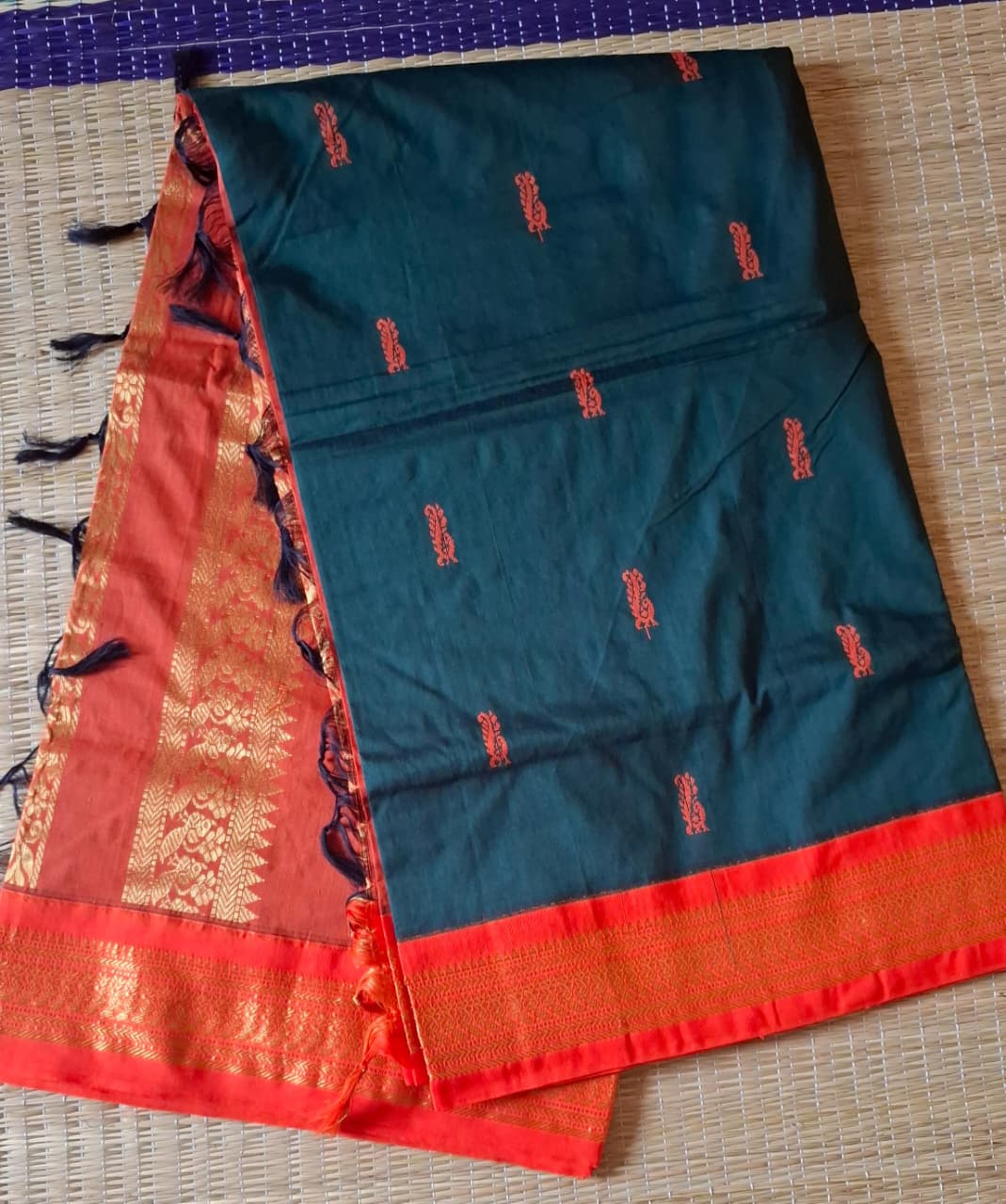 Bottle  green saree with orange border blouse and rich blouse