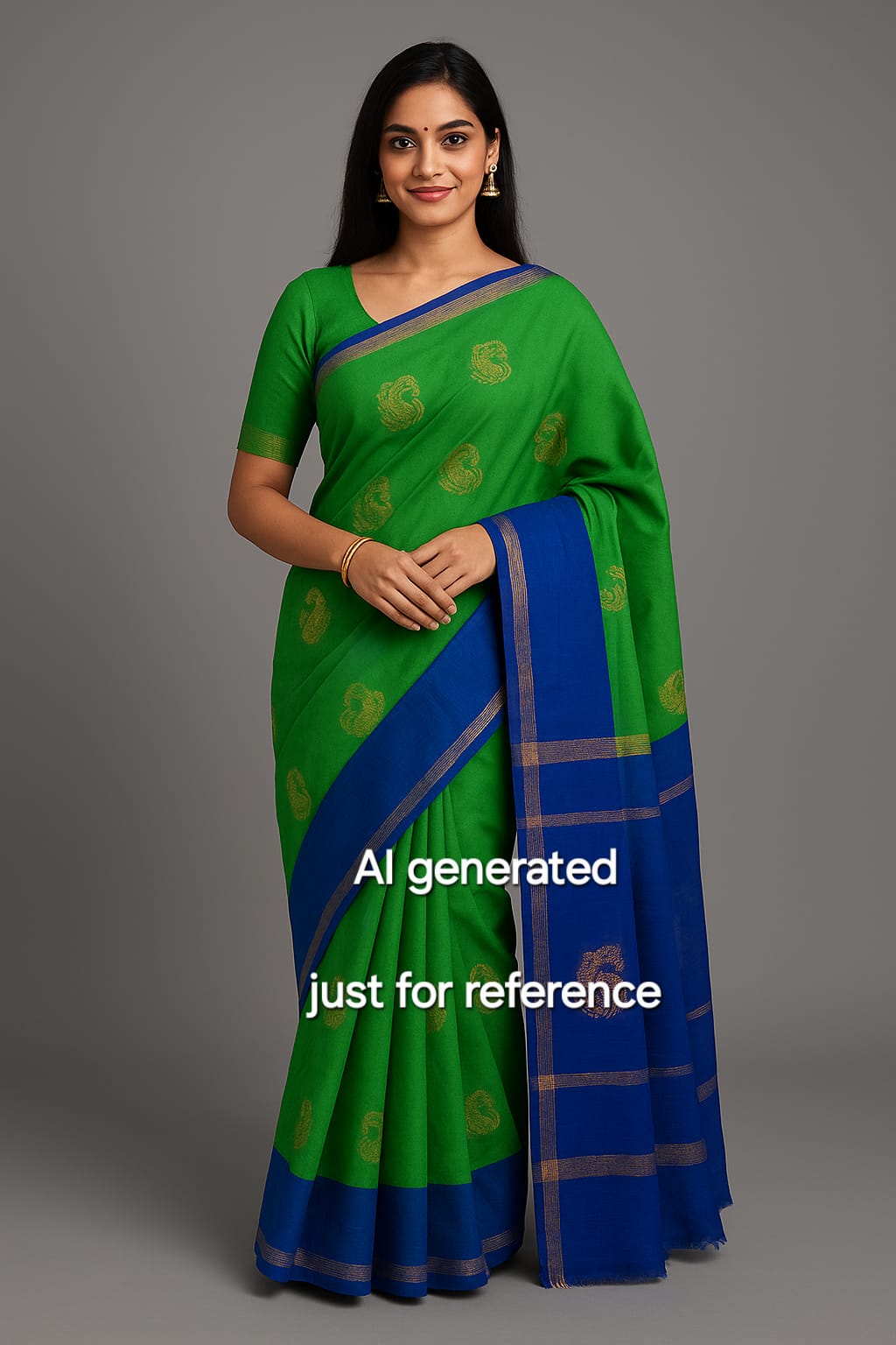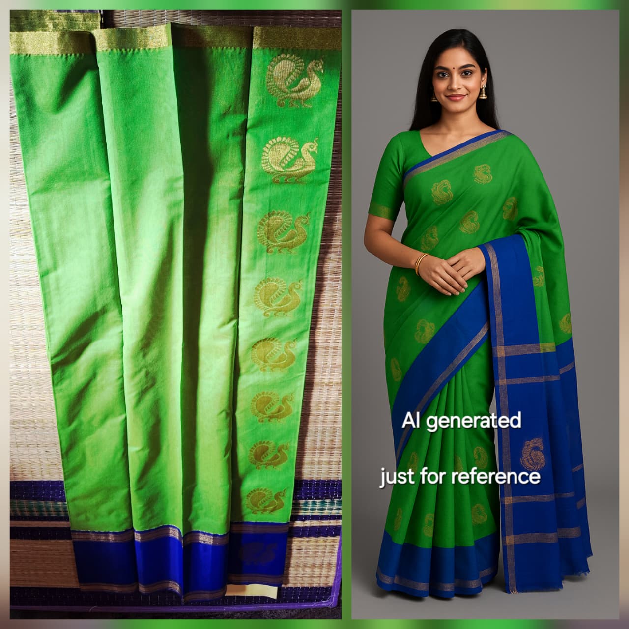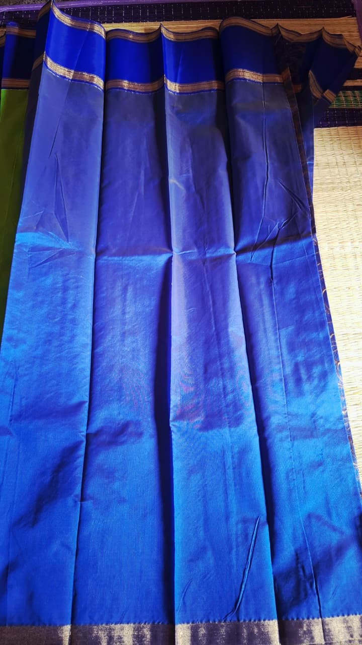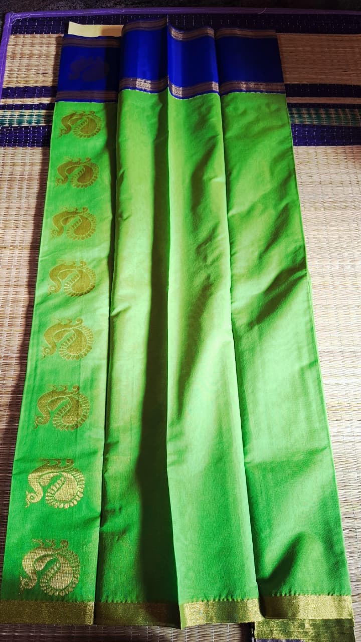 + Free ShippingParrot Green Saree with Blue border blouse and pallu