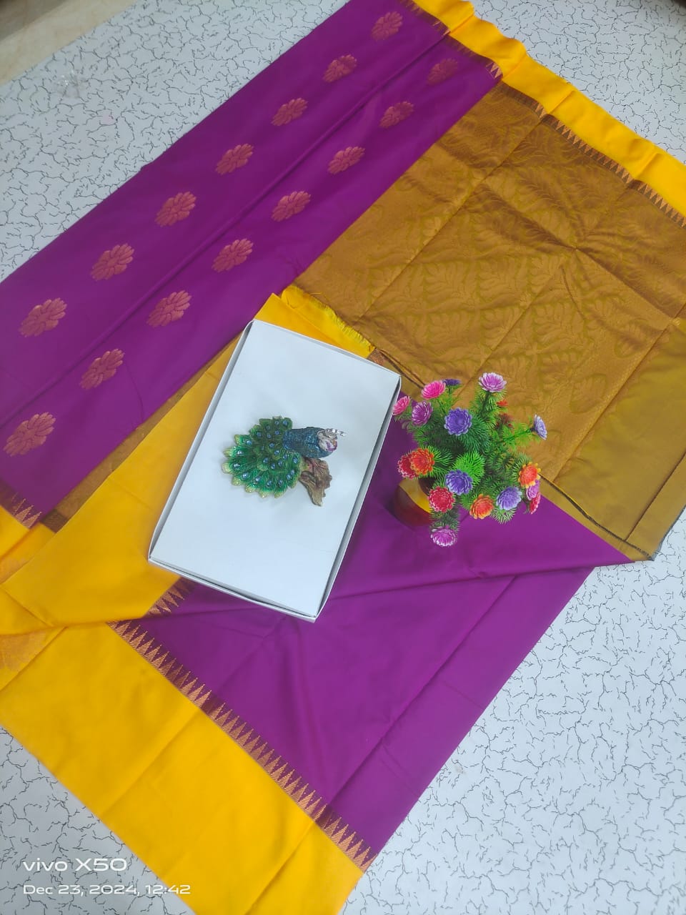 + Free ShippingPurple Soft Silk Saree with yellow border blouse and pallu