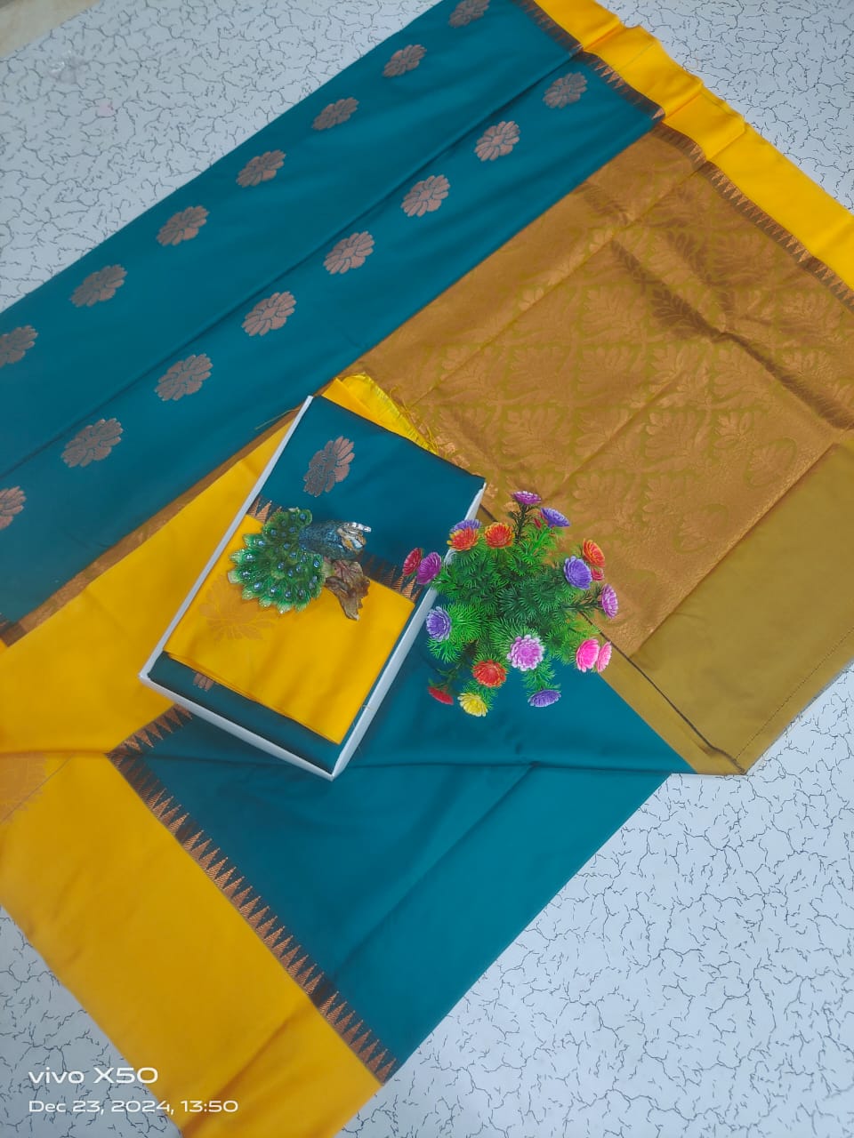 Teal blue soft silk saree with yellow border blouse and pallu.