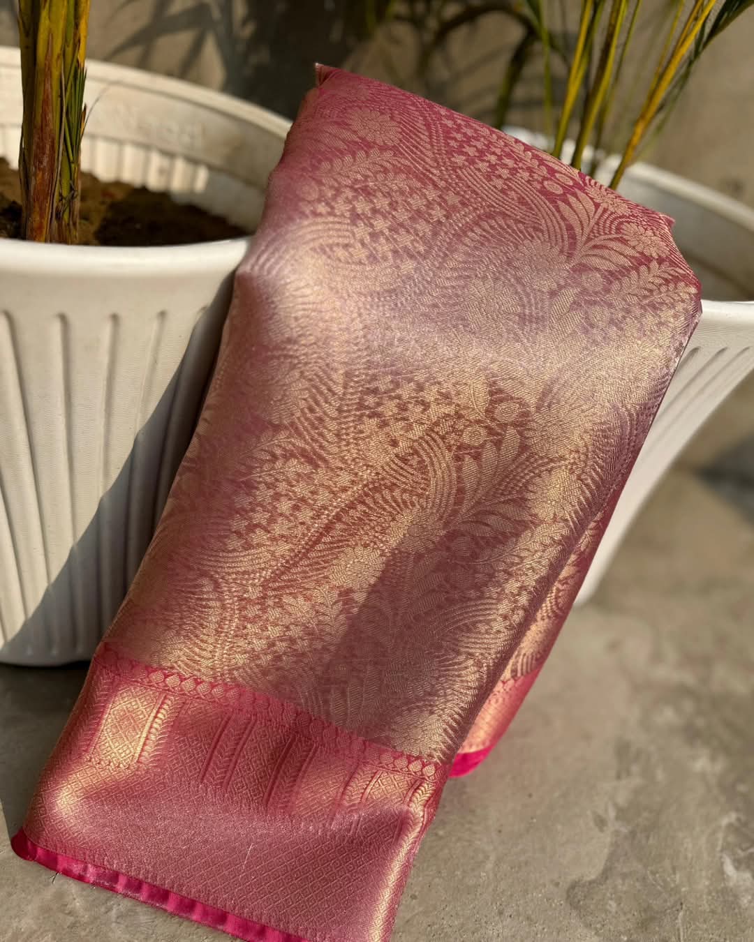 Crafted from rich Kanjivaram tissue silk, this saree features a detailed pallu that highlights intricate craftsmanship. The vibrant colors and luxurious fabric …