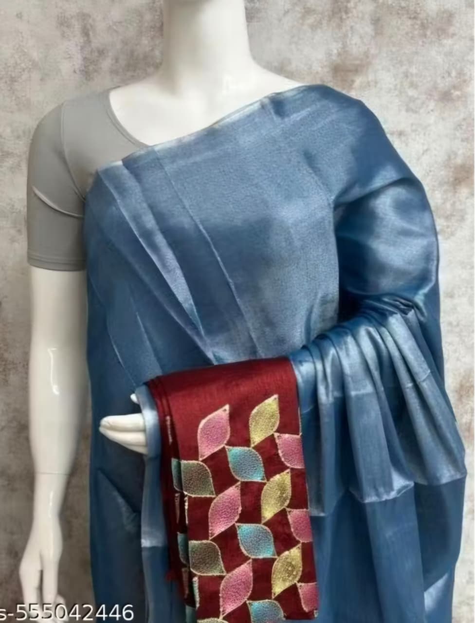 + Free ShippingBlue tissue saree with marron designer blouse