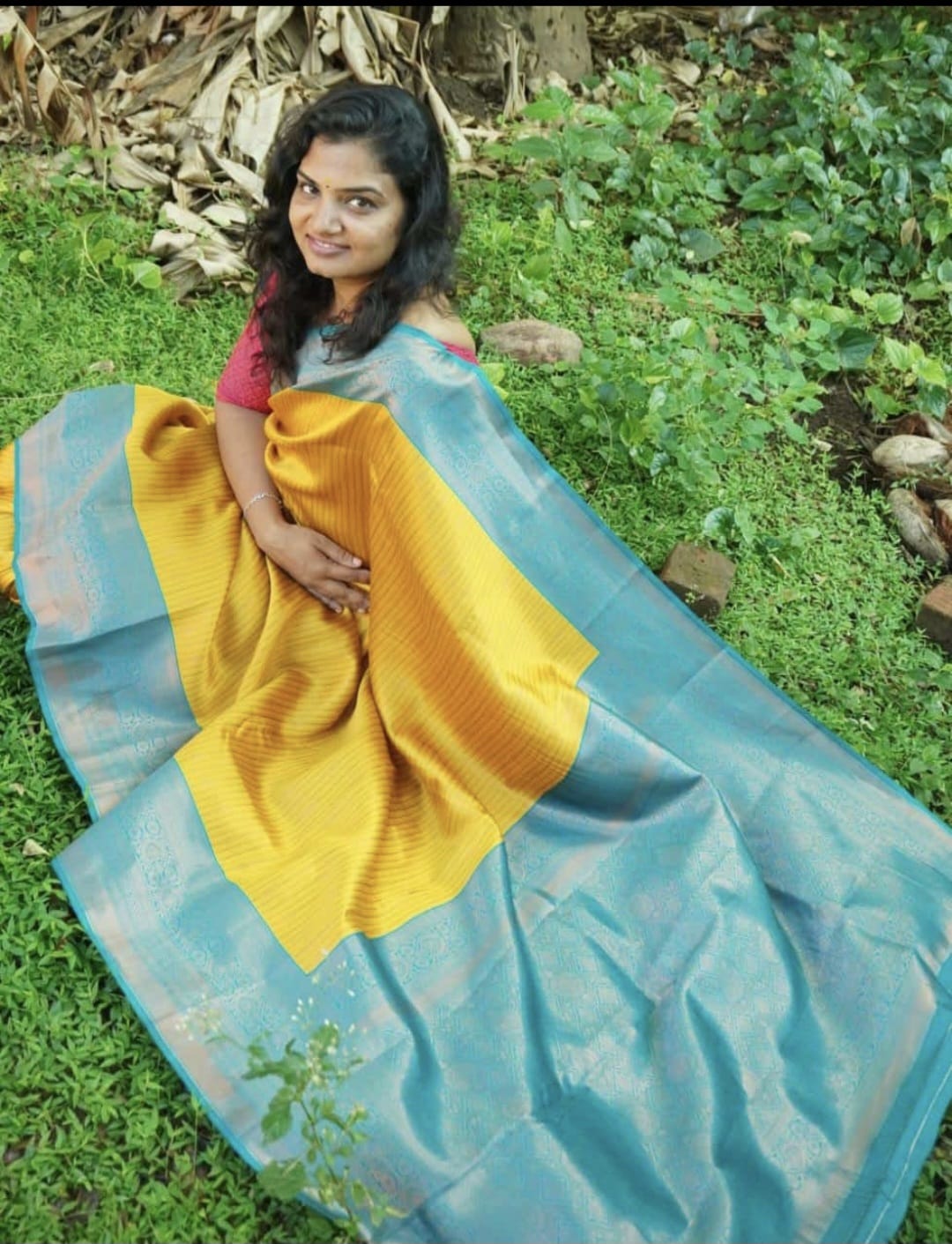+ Free ShippingYellow Saree with teal border blouse and pallu